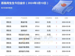 根据最新信息,周生生黄金回收价格每日都会变化,具体价格需要以品牌官网或线下门店公布的价格为准。截至2025年3月18日,周生生足金饰品的标价为910元/克,较前一日上涨了3元/克。此外,周生生黄金回收价格大约在728元/克左右,但具体价格会根据国际黄金价格和品牌规则而浮动。建议您在决定回收黄金时,关...